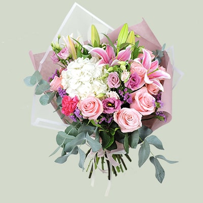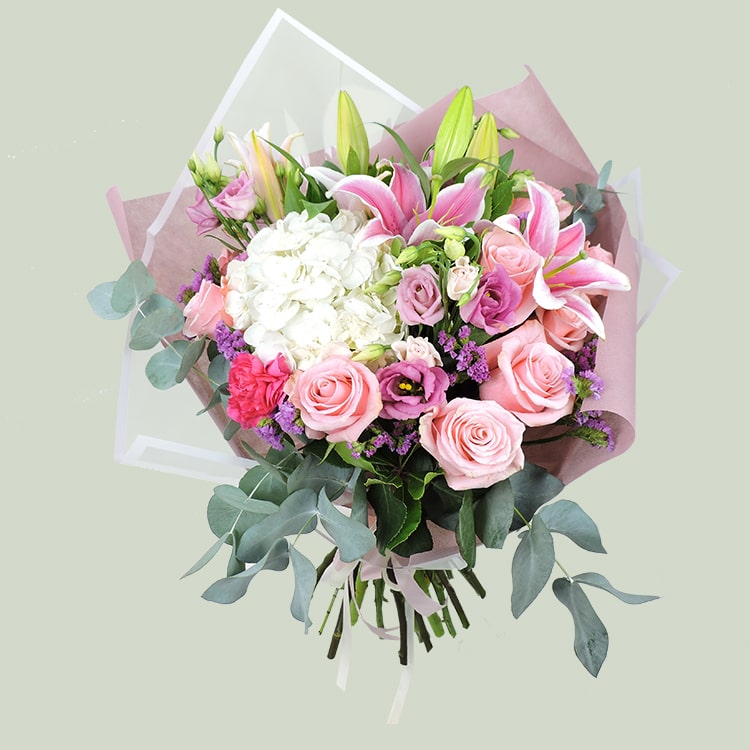 Bouquet in pink shades with lilies, roses, lisianthus, eucalyptus, and hydrangea, with elegant wrapping. Dimensions: H=60 cm, W=60 cm.
